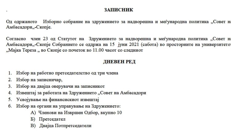 Согласно член 23 од Статутот на Здружението за надворешна и меѓународна политика „Совет на Амбасадори„-СкопјеСобранието се оддржа на 15 јуни 2021 (сабота) во просториите на универзитетот „Мајка Тереза„ во Скопје со почеток во 11.00 часот со следниот