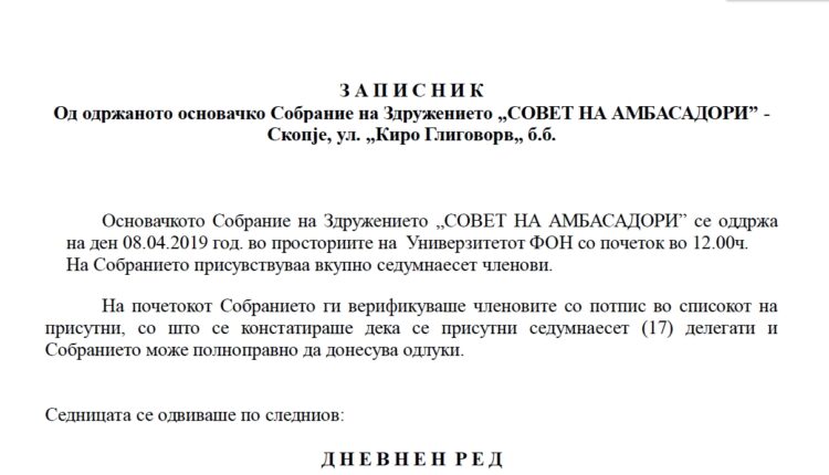 Од одржаното основачко Собрание на Здружението „СОВЕТ НА АМБАСАДОРИ” –